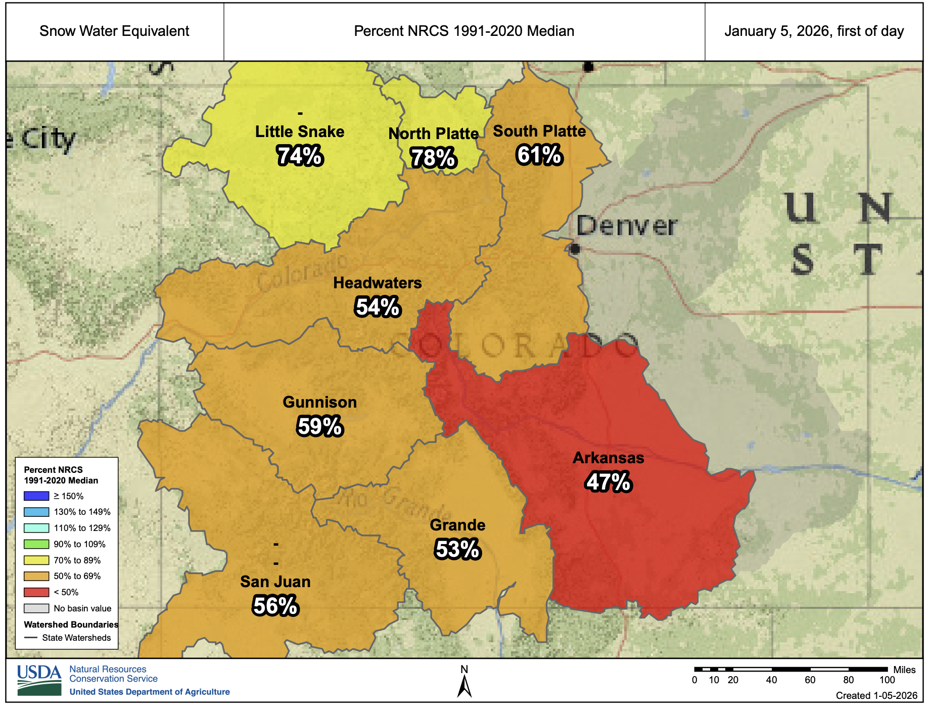 Record high temperatures drive record low snowpack. On December 1, record low SWE conditions were present at 52 regional Snotel sites in northern Colorado, northern Utah, and across Wyoming. Despite very low snowpack conditions, water year precipitation is above average for the region, except in northern Colorado. During early October, daily precipitation records were set in Utah and Colorado, including widespread flooding in southwest Colorado. Due to the tropical origin of those storms, nearly all precipitation fell as rain. Contrasting precipitation, water year temperatures are much above average with record high temperatures observed in parts of western Colorado, eastern Utah, and southwestern Wyoming. Consequently, the current snow drought is primarily the result of high temperatures rather than low precipitation. While October precipitation generally fell as rain in regional mountains, above average precipitation has increased soil moisture, which could help to bolster the efficiency of runoff in 2026.