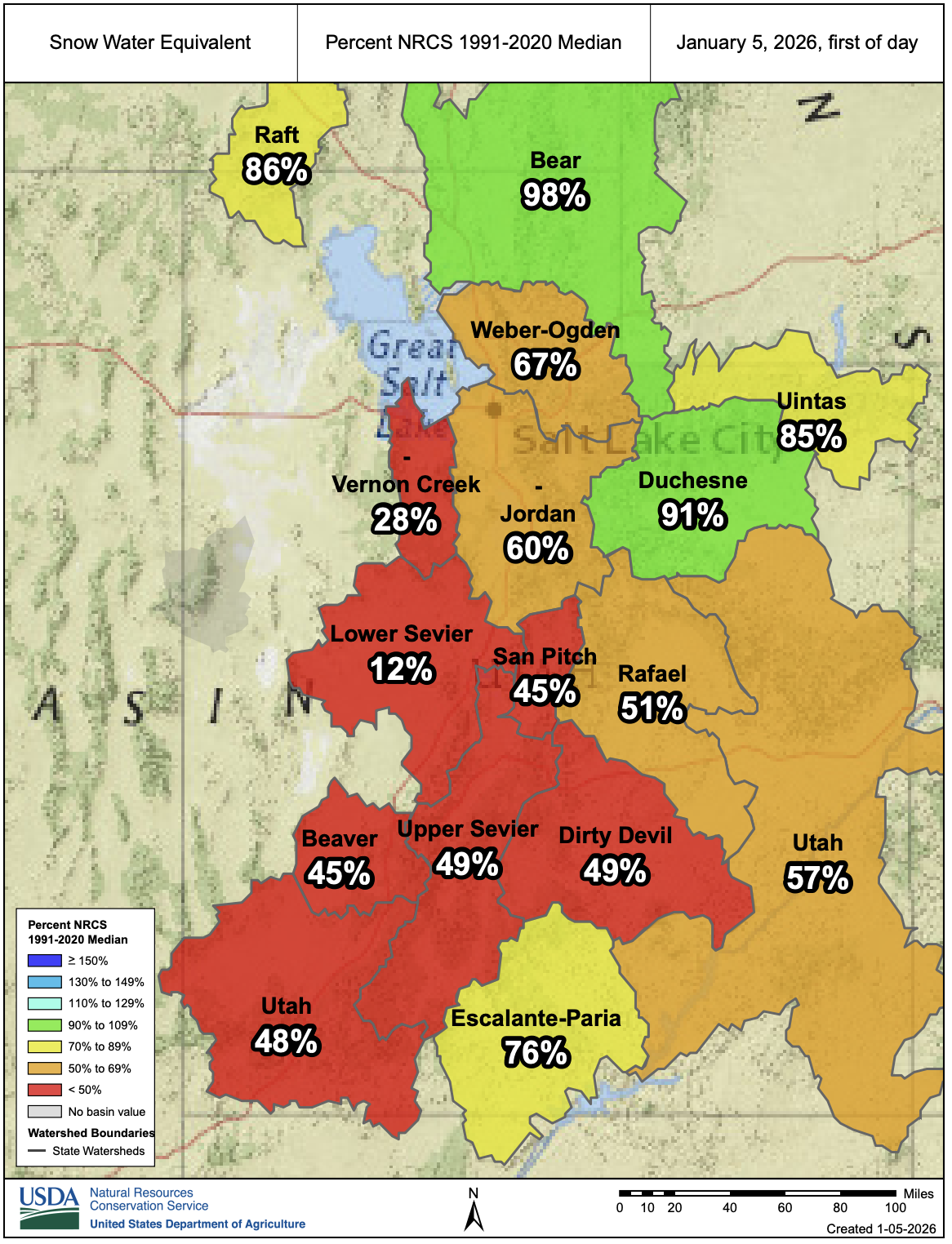 Record low SWE conditions exist at many locations in Colorado, Utah and Wyoming. A hot and dry November left most regional river basins with SWE conditions at less than 50% of average, with the least snow in the Six Creeks near Salt Lake City, where December 1st SWE is 22% of median. Slightly better SWE conditions exist in southern Colorado and southern Utah.
